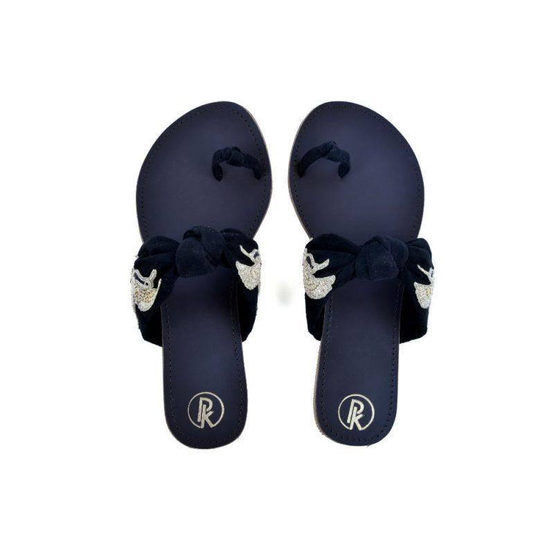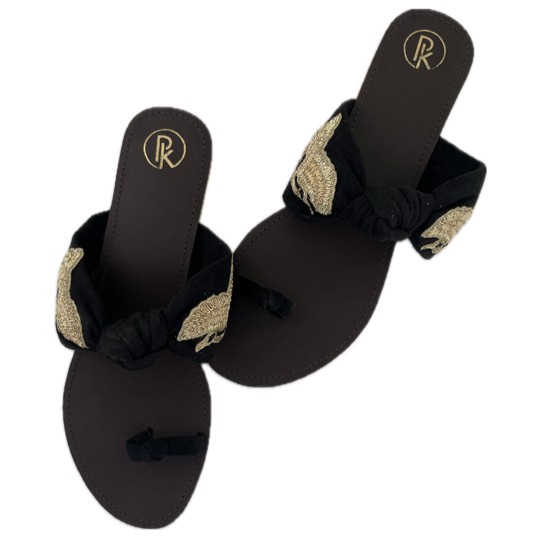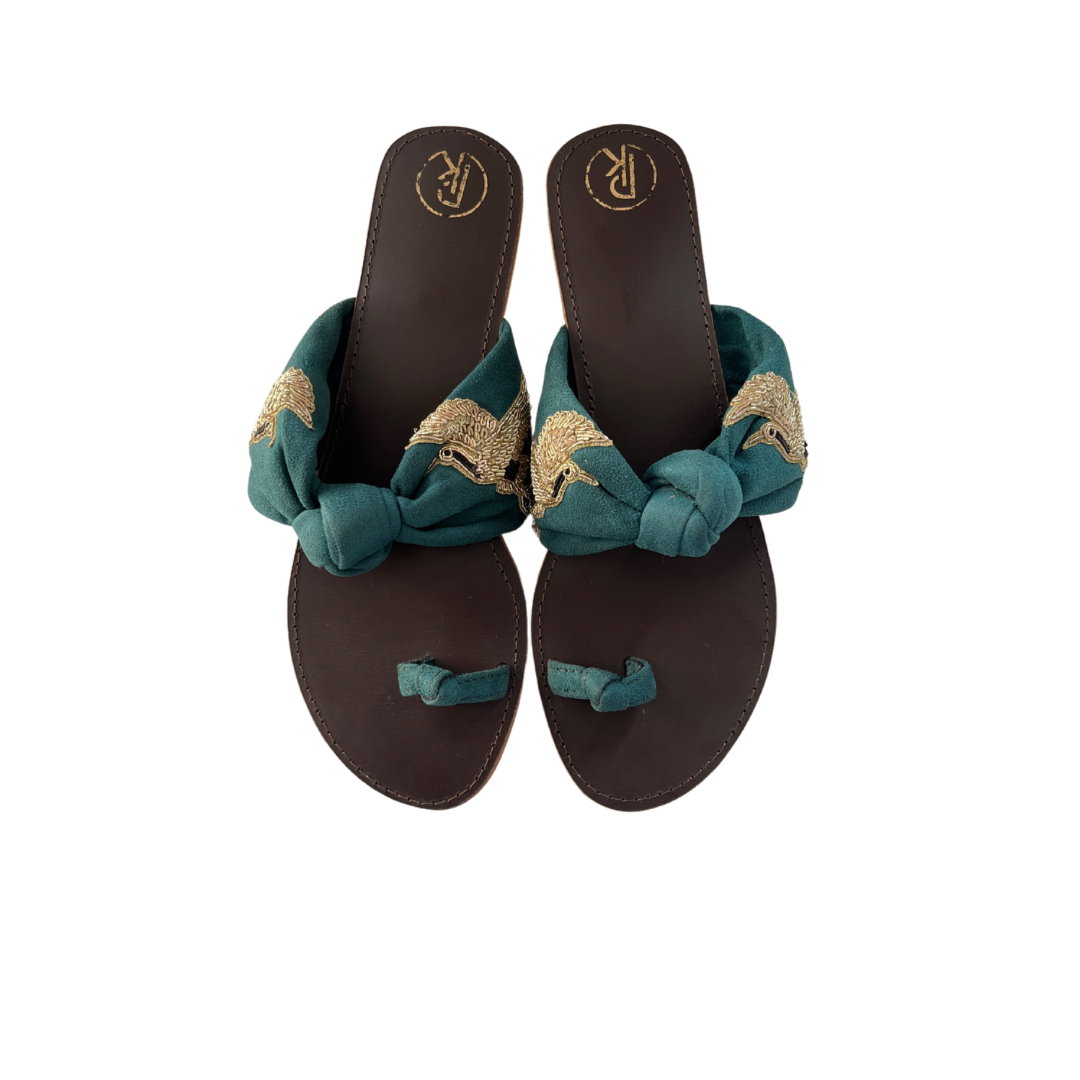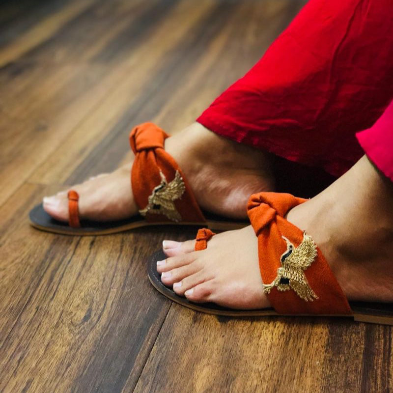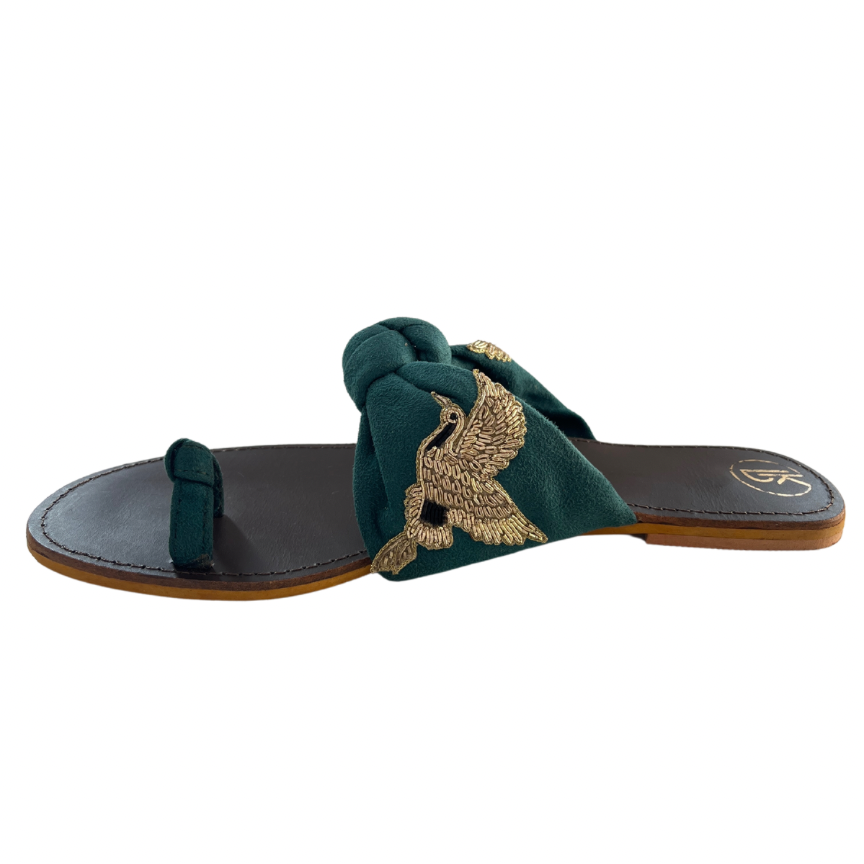 These suede knotted flats feature hand-embroidered birds on all four sides, making them a unique and charming addition to your wardrobe. Perfect for vacation or a laid-back brunch, these bestselling flats are sure to make a statement. Elevate your style with these one-of-a-kind Bird Flats.
