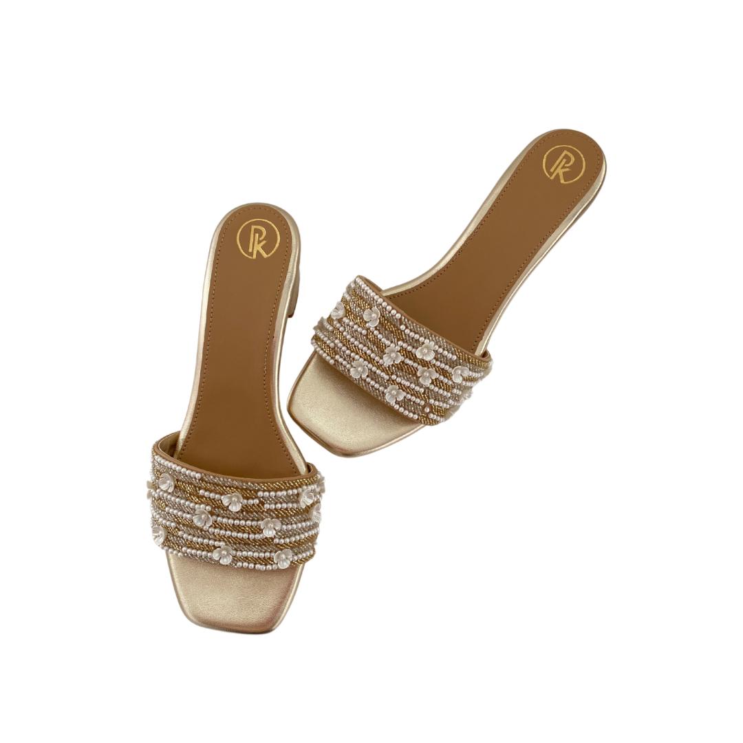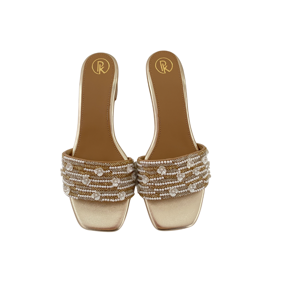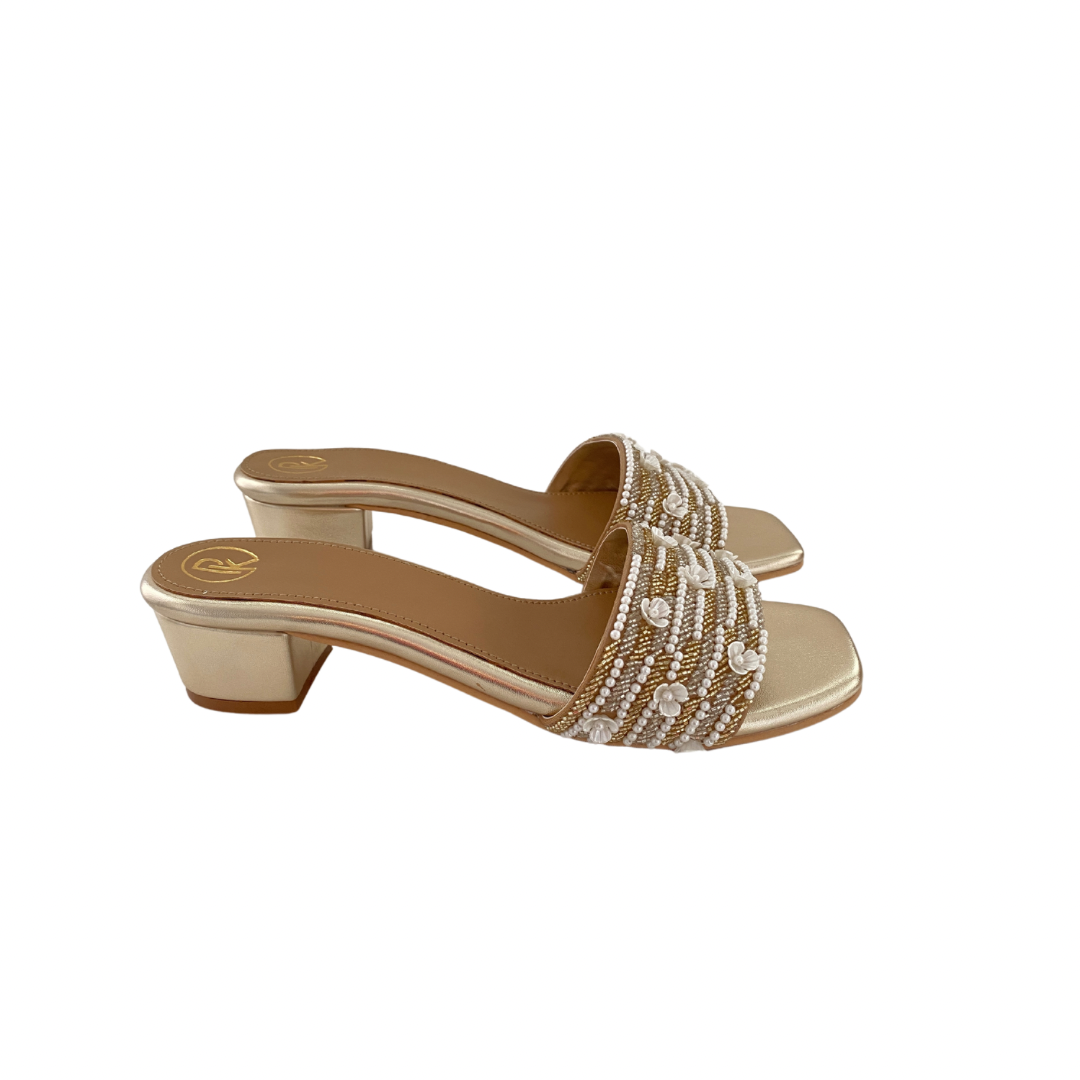 Elevate your style with our Blooming heels. Hand-embroidered straps featuring delicate flowers, in a sophisticated gold and silver combination. Paired with a comfortable 2-inch block heel and cushioned insole for all-day chic comfort. Step into luxury with every step.