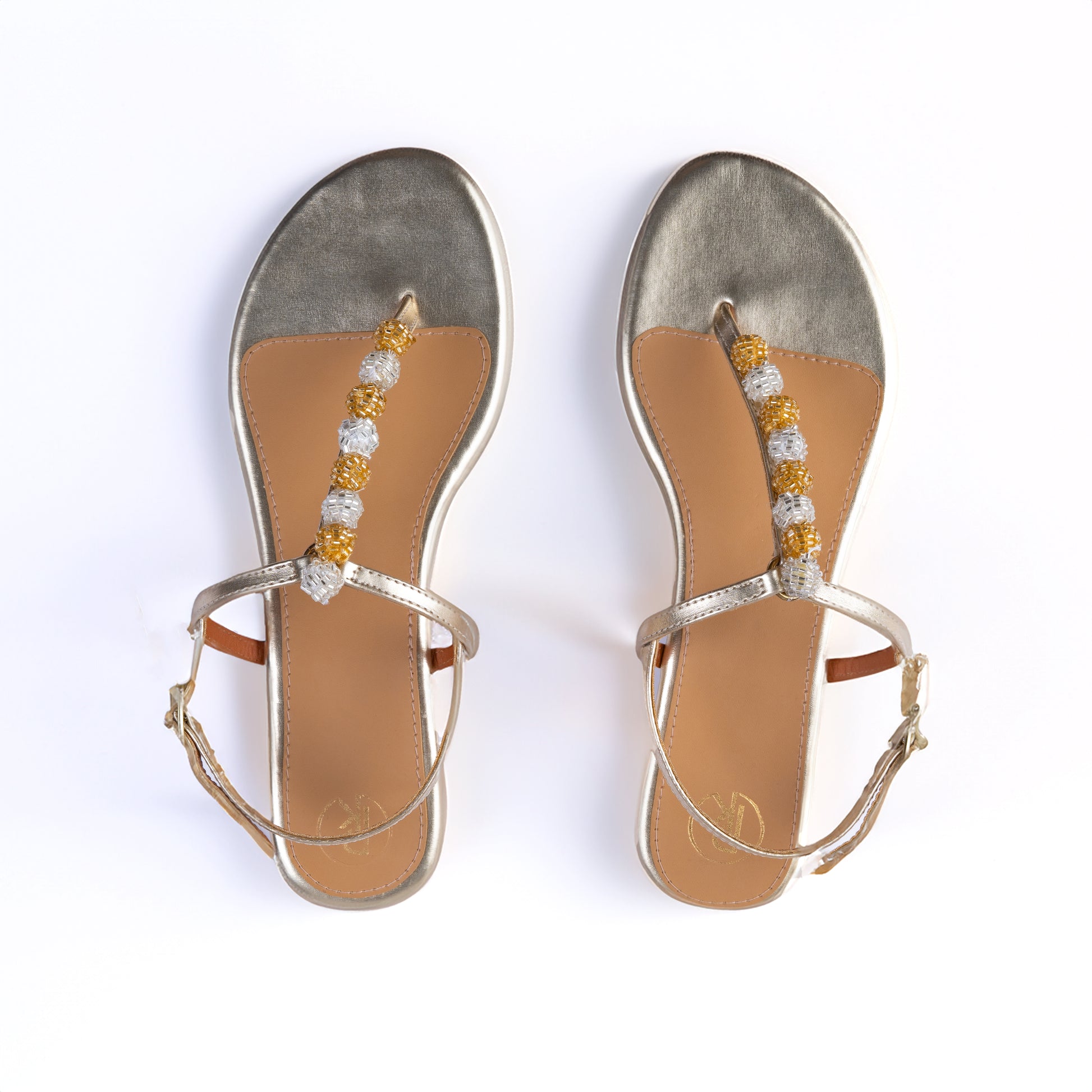 Sleek, versatile, and perfect for any occasion. These Burano T Strap Flats are the ultimate must-have for your wardrobe. Whether you're heading out on a vacation or a casual outing with friends, these beautifully handcrafted flats will elevate any outfit. Available in stunning gold or tan, the delicate cutdana ball embellishments add a touch of elegance to the classic T strap design.