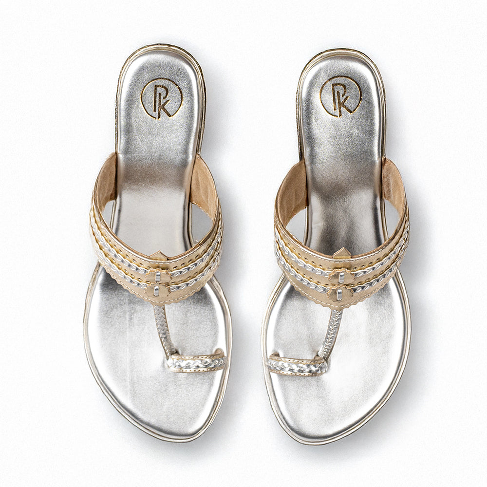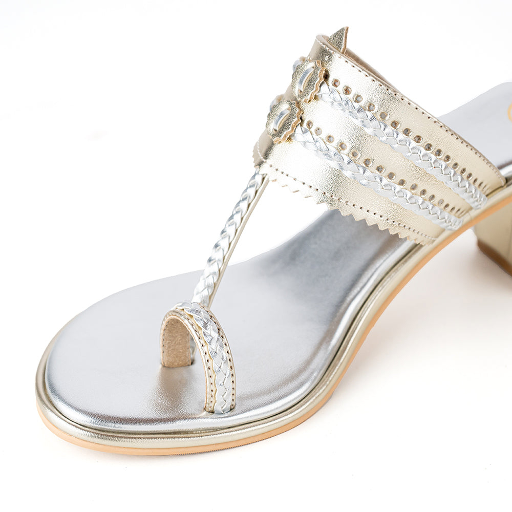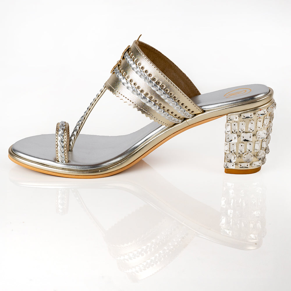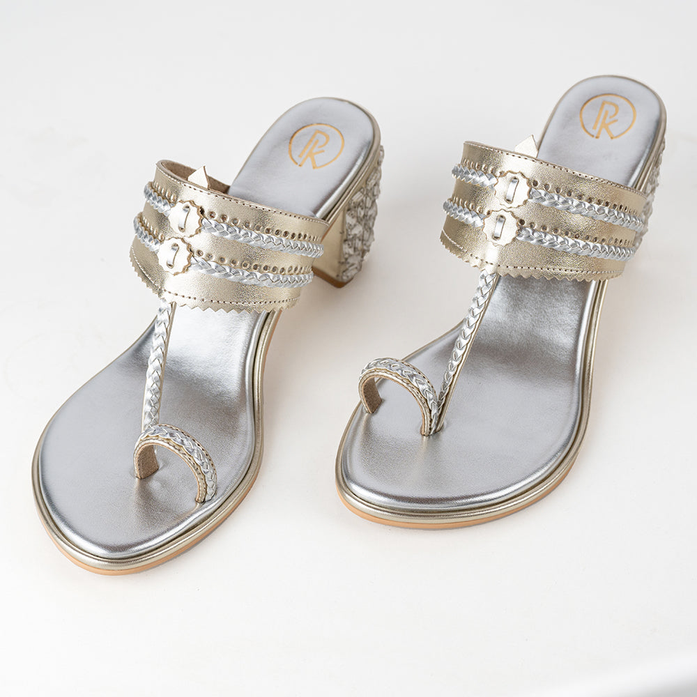 These Gold & Silver two-tone Kolhapuri block heels combine traditional charm with modern style. Featuring 3-inch block heels adorned with intricate embellishments, they offer both elegance and stability. Perfect for adding a sophisticated touch to any outfit, these heels balance comfort and eye-catching design for confident wear throughout the day or evening.