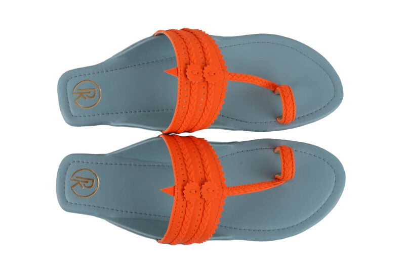 Featuring a neon orange hand-braided upper paired with a tan base, this Kolhapuri showcases a stylish color block design that blends traditional craftsmanship with contemporary trends.