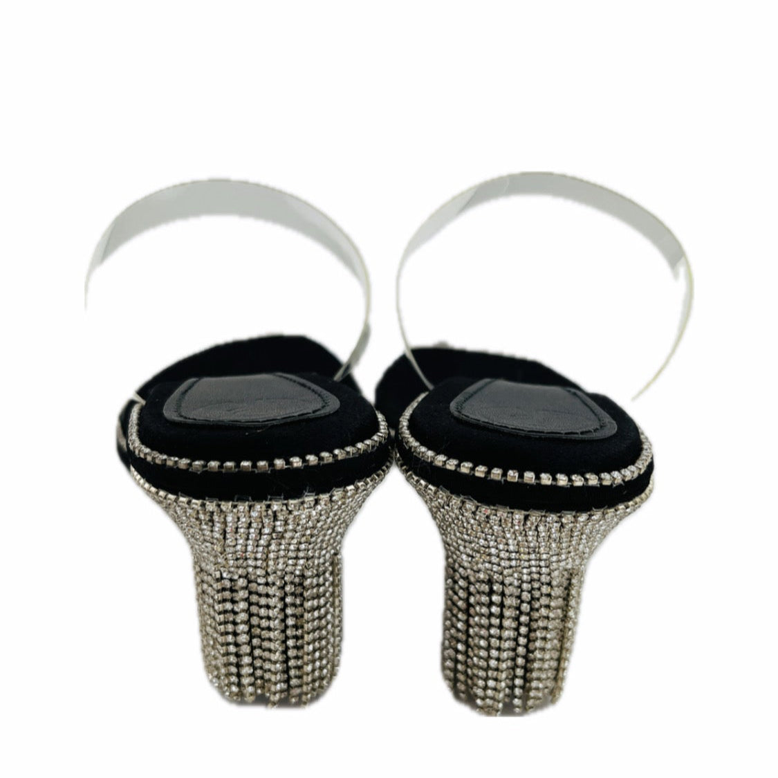 The Onyx Wedges feature a black wedge with two straps, and are detailed with a hand embroidered silver crystal tassels covering the heel. Get the perfect touch of elegance with these stylish wedges for any occasion.