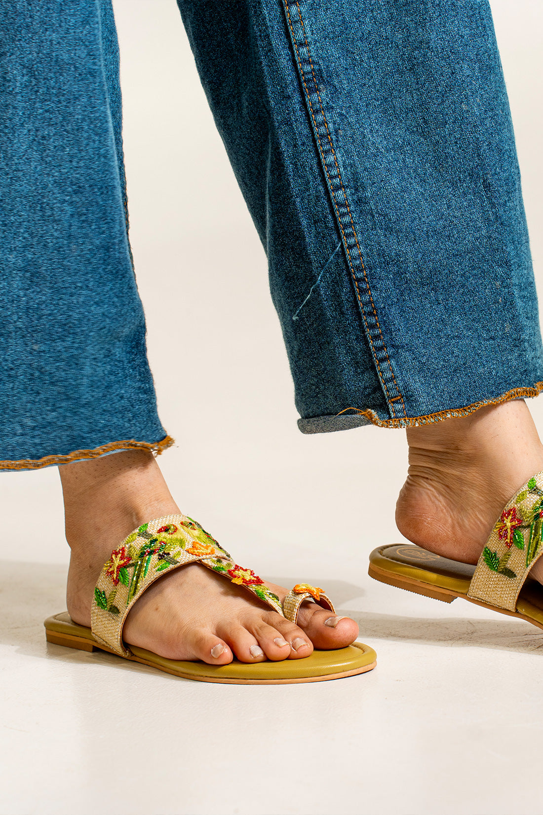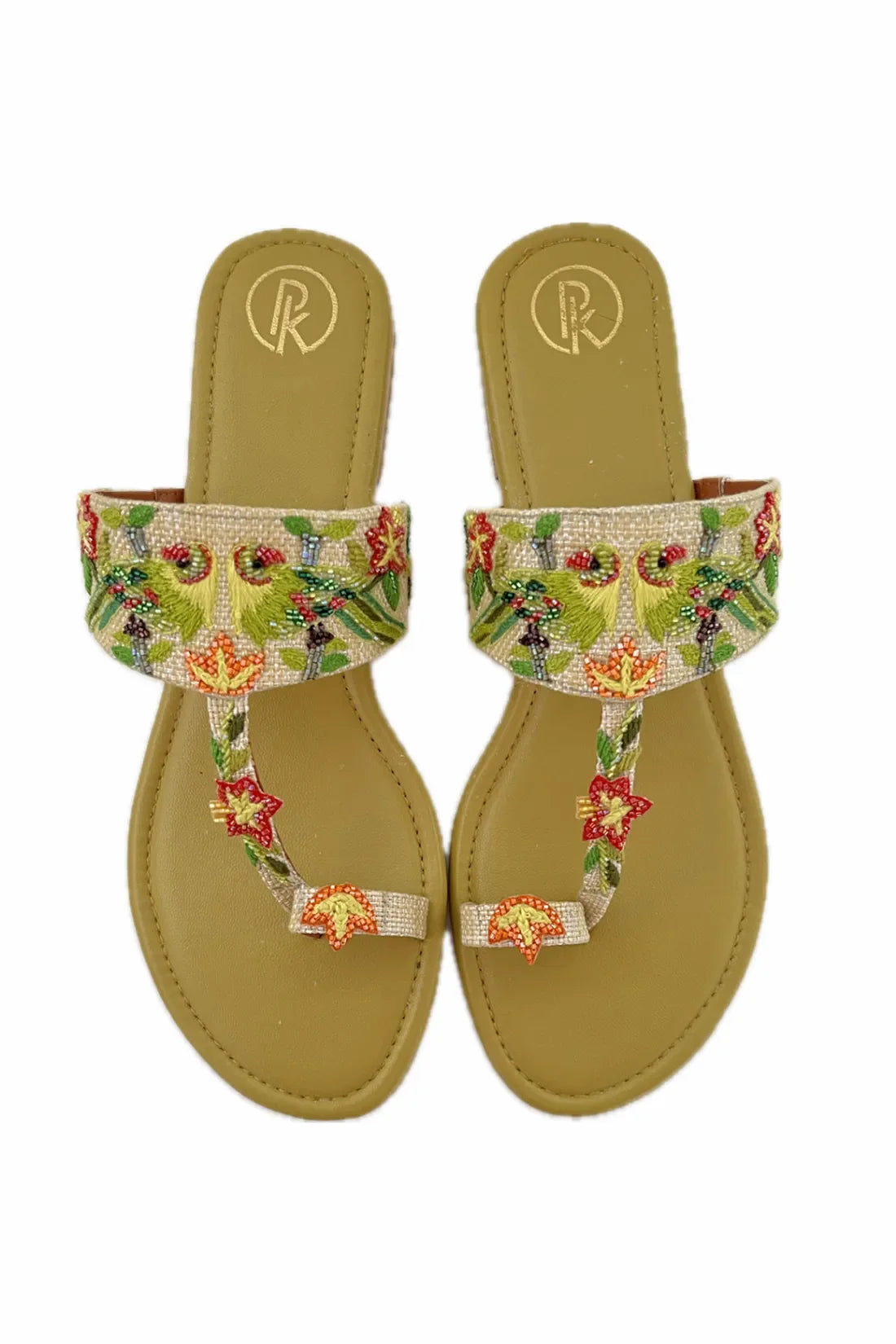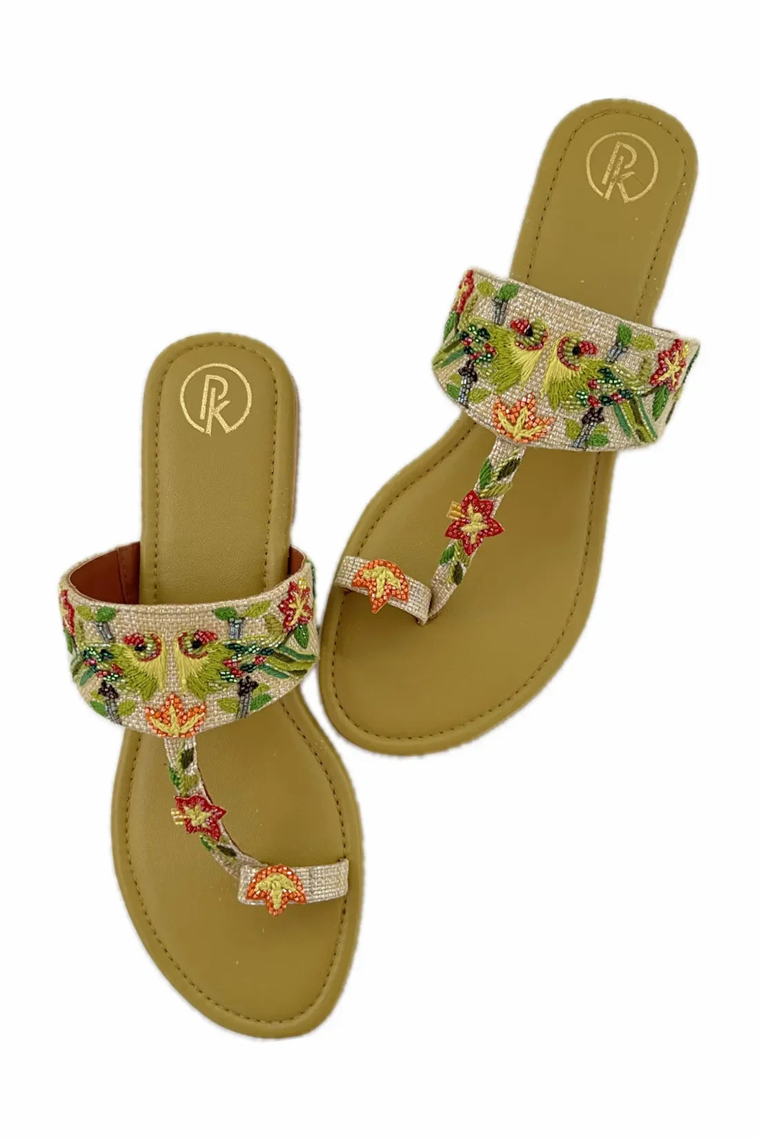 Theses are one-of-a-kind flats featuring hand-embroidered parrots and bright flowers on a neutral base, creating a fun and elegant look. Versatile and colorful, they add just the right amount of personality to any outfit.