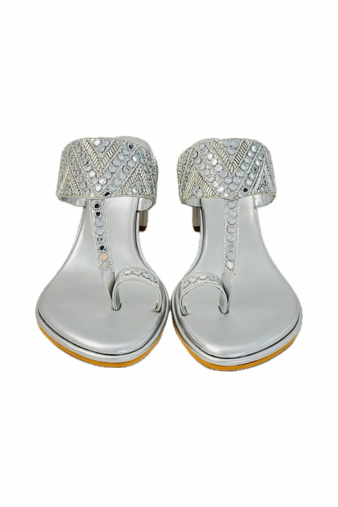 Expertly crafted with hand-embroidered sheesha and silver resham work, these Kolhapuri block heels make a statement. The intricate designs on a silver base add a touch of elegance to any outfit. Step out in style with these unique and beautiful heels.