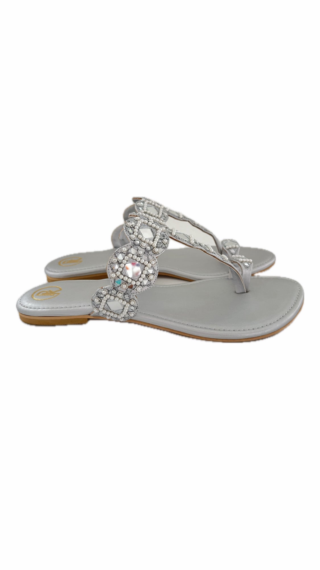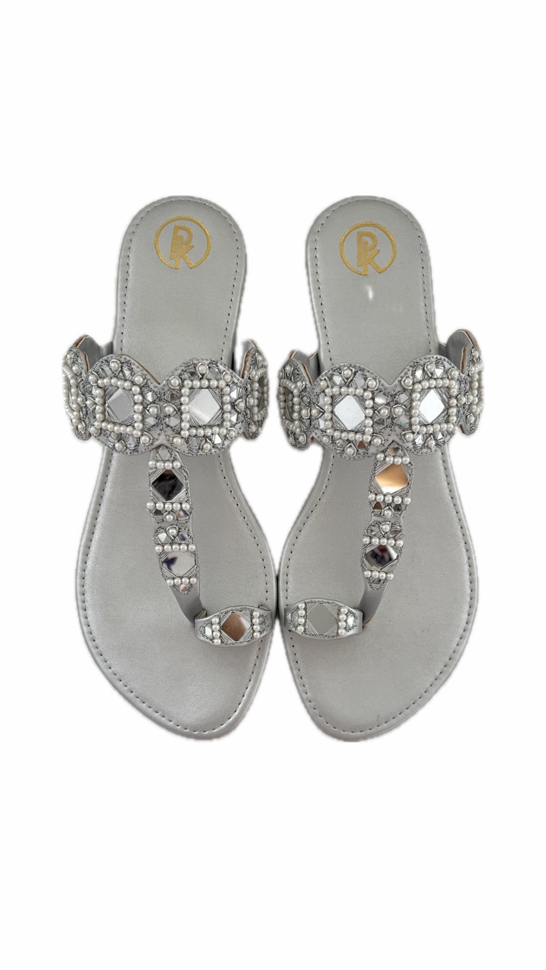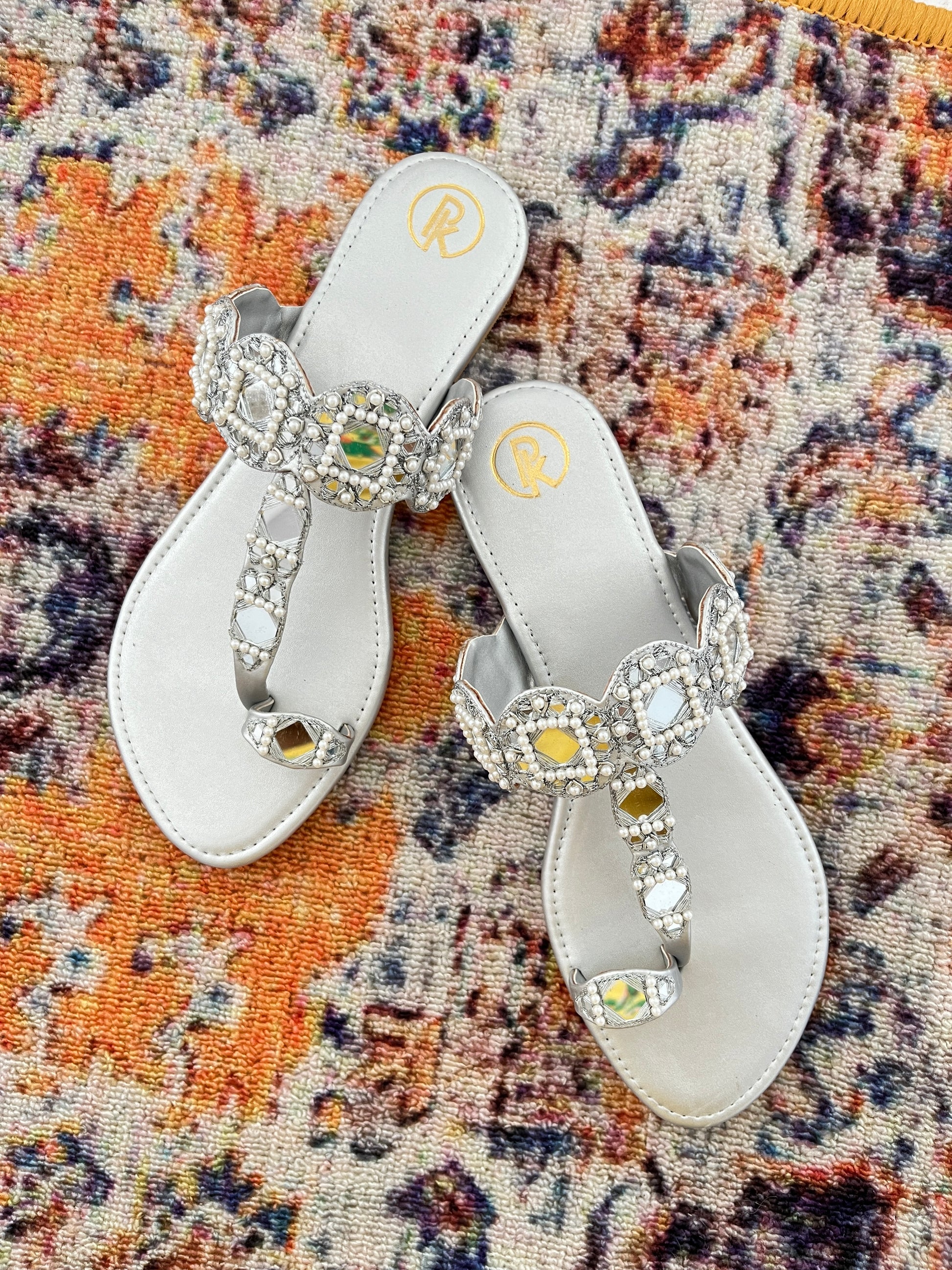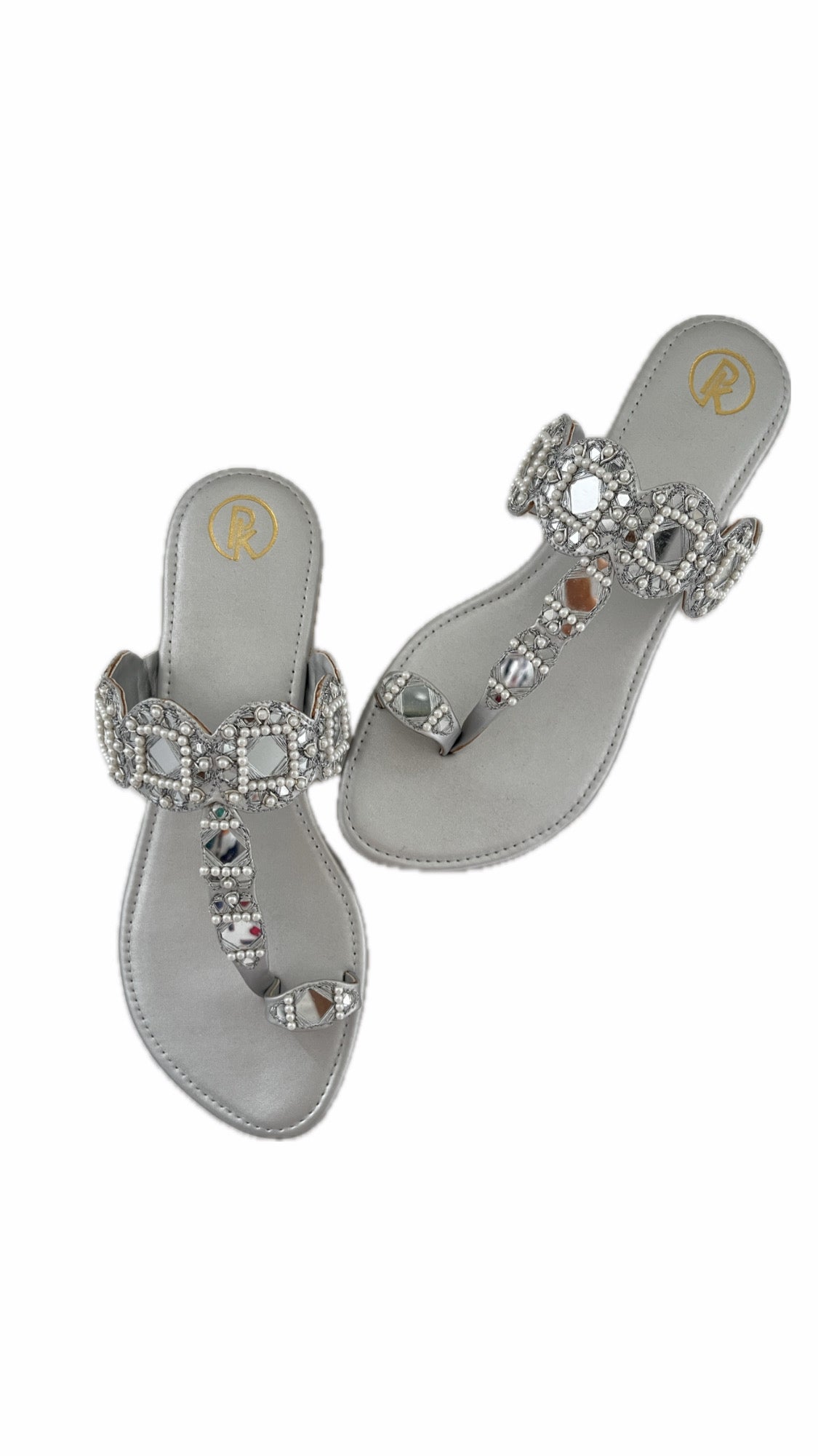 Step up your summer shoe game with our SILVER SHEESHA KOLHAPURI FLATS. These must-have flats are hand-embroidered with SHEESHA and intricate pearl details, adding a touch of elegance to any outfit. Elevate your style and stay comfortable all summer.